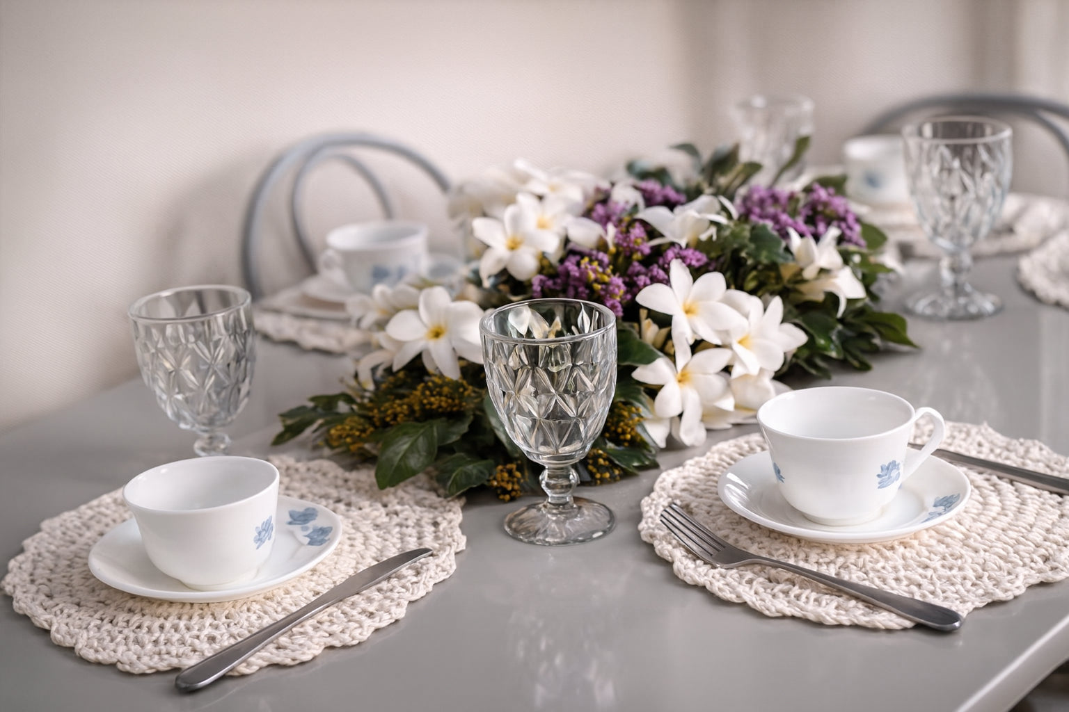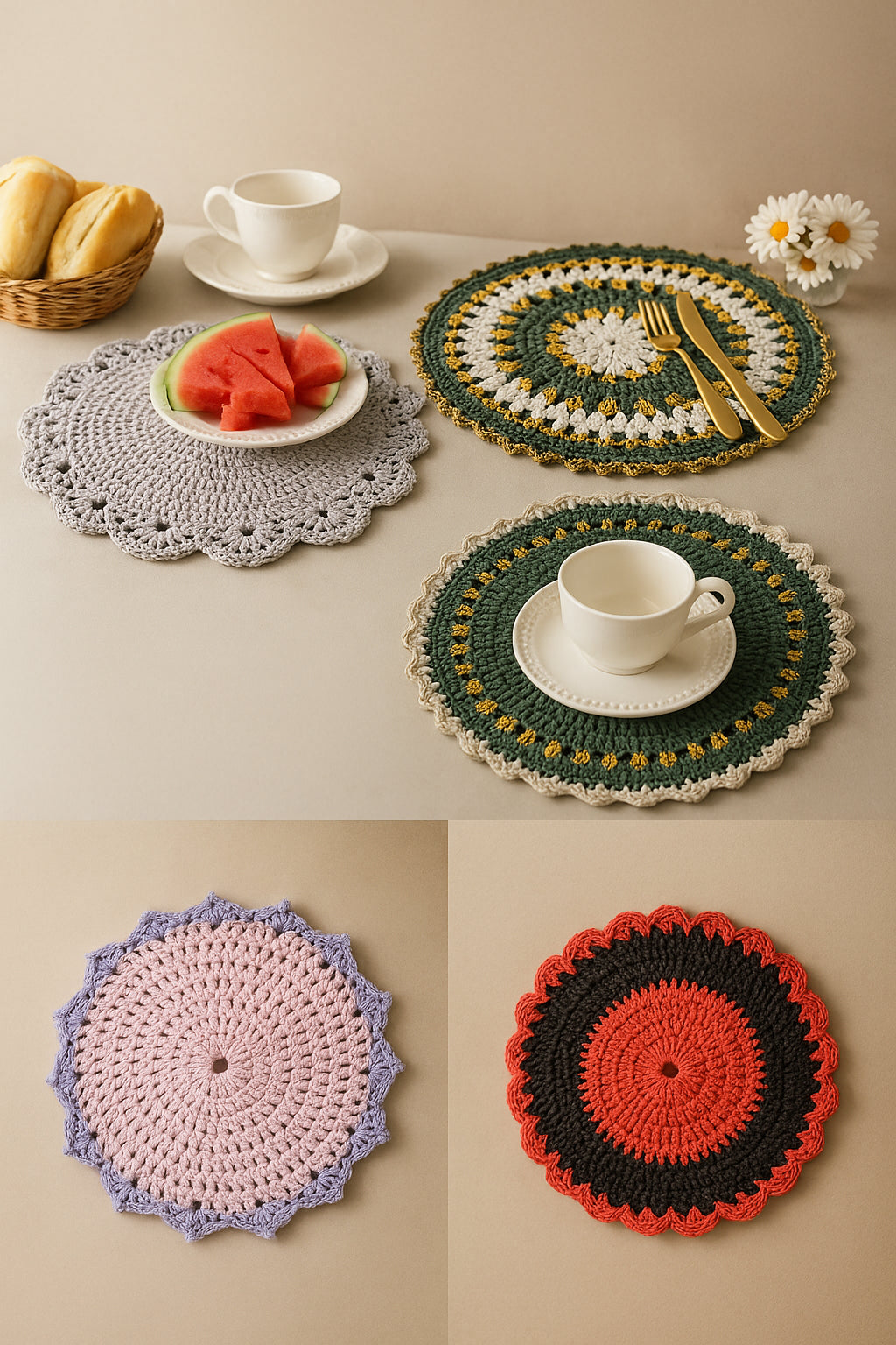 O conjunto de suplás feitos à mão traz textura, cor, aconchego e aquela sensação de “casa viva”, que só o trabalho artesanal é capaz de entregar.